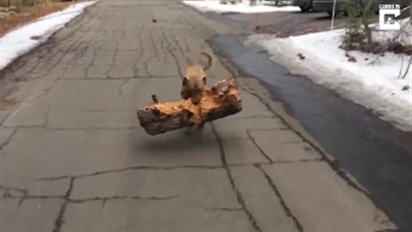 كلب يحمل جذع شجرة ضخم بفكيه (فيديو)