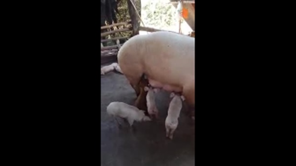 شاهد.. أنثى خنزير ترضع كلب مع صغارها