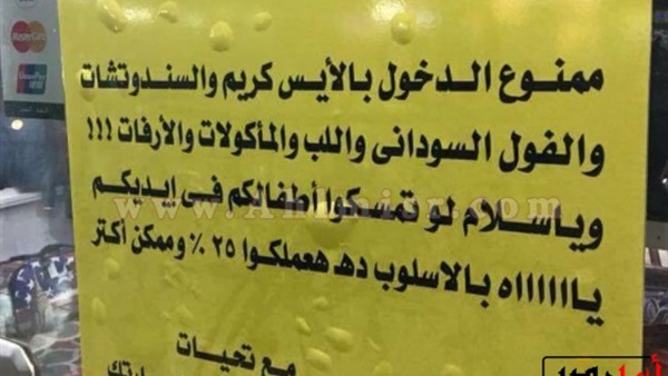 واللافتة تمنع دخول المأكولات والتسالي والآيس كريم بكل الأنواع بالإضافة لتعليف لاذع وساخر حول الأطفال وضرورة مراقبتهم اثناء زيارة المكان، ووضع ايضا جملة تعقيب عن أهمية التربية السليمة لسلوك اطفال الزائرين.