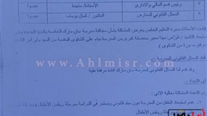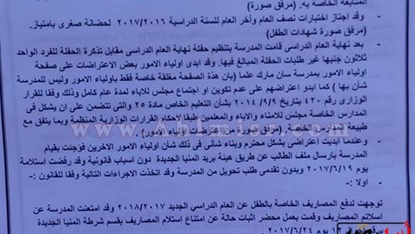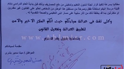 تقدم مينا سمير بشري ببلاغ إلى المحامي العام الأول لنيابات جنوب المنيا، ضد وكيل وزارة التربية والتعليم، ومديرة مدرسة لعدم تنفيذ قرار قانوني بعودة نجله للالتحاق بإحدى المدارس الخاصة.