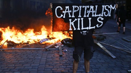 ويحتج المتظاهرون على الوظائف منخفضة الأجر والعقود العمالية قصيرة الأجل مما دفعهم لمحاولة اختراق موقع الاجتماع اليوم.