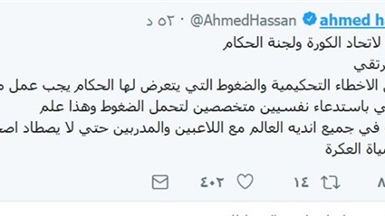 وكتب "حسن" عبر حسابه على "تويتر": "نصيحة لاتحاد الكورة ولجنة الحكام.. حتى نرتقي.. بعد كل الاخطاء التحكيمية والضغوط التي يتعرض لها الحكام يجب عمل محاضرات للتأهيل النفسي باستدعاء نفسيين متخصصين لتحمل الضغوط وهذا علم".