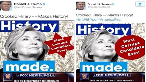 وحذف ترامب الصورة، التي نشرت يوم السبت، في وقت لاحق من على حسابه، واستبدلها بصورة مماثلة إلا أن العبارات وضعت داخل دائرة، ولكن ليس قبل أن تتسبب الصورة في موجة غضب، بعد أن ربط بين كلينتون وصورة نمطية معادية للسامية.