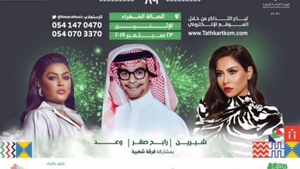 وأشار بأن احتفالات اليوم الوطني ستختتم بمجموعة متنوعة من المفاجآت والحفلات بمركز الملك فهد الثقافي بالعاصمة الرياض والذي سيجمع المطرب حسين الجسمي والفنانة أحلام والفنان عبادي الجوهر وراشد الفارس، وسيطل في حفل مدينة جدة النجم رابح صقر والفنانة وعد والفنانة شيرين وذلك في مدينة الملك عبدالله الرياضية، كما تحيي في الصالة الخضراء بالدمام المطربة نوال الكويتية والفنان عايض أمسية ساهرة بهذه المناسبة الغالية.