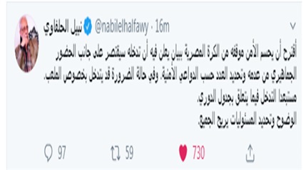 كتب الفنان نبيل الحلفاوى عبرموقع التواصل الاجتماعي تويتر تغريده يعرض فيها اقتراح بمواصلة استكمال الدوري المصري حيث قال "أقترح أن يحسم الأمن موقفه من الكرة المصرية ببيان يعلن فيه أن تدخله سيقتصرعلى جانب الحضور الجماهيري من عدمه وتحديد العدد حسب الدواعي الأمنية. وفي حالة الضرورة قد يتدخل بخصوص الملعب. مستبعدا التدخل فيما يتعلق بجدول الدوري.الوضوح وتحديد المسئوليات يريح الجميع".