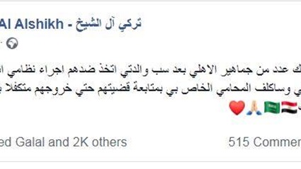 ونشر تركي آل شيخ فى منشور له على صفحته الخاصة على فيس بوك قائلا" لم اكن اعلم ان هناك عدد من جماهير الاهلي بعد سب والدتي اتخذ ضدهم إجراء نظامي انا مسامح في حقي فهم اخواني واحبابي وسأكلف المحامي الخاص بي بمتابعة قضيتهم حتي خروجهم متكفلا بكافة المصاريف ومساعدتهم بد ذلك"
