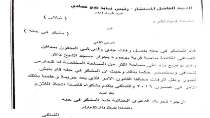 تقدم أهالي الفساقي، بقرية بهجورة، بمركز نجع حمادي، شمال قنا، اليوم السبت، بشكوى رسمية مكتوبة للنيابة، ضد "الفحار" حارس المدافن، بتهمة الاستيلاء على الأرض الخاصة للجبانة، وأنه استغل غيابهم ورفع قضية وأخذها بحكم قضائي دون علم الأهالي.