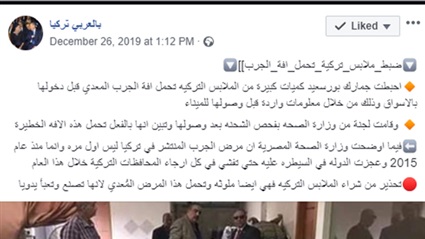 ويذكر أن جمارك بورسعيد أحبطت كميات كبيرة من الملابس التركيه تحمل مرض الجرب المعدي قبل دخولها بالاسواق وذلك من خلال معلومات واردة قبل وصولها للميناء، بعد صدور معلومة لهم،وقامت لجنة من وزارة الصحه بفحص الشحنه بعد وصولها وتبين انها بالفعل تحمل هذه الآفة الخطيرة، وفقاً لصفحة "بالعربي تركيا".