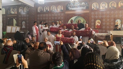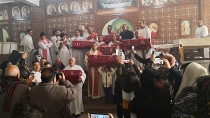 حيث أقامت المطرانية قداسًا بحضور أهالي الشهداء، وسط حضور الأهالي وأصدقاء الشهداء، بعدما صنعوا أيقونات تزينها آيات من الكتاب المقدس، في محاولة منهم للتعزي في وفاة ذويهم، حاملين معهم رفات الشهداء أثناء الصلاة.