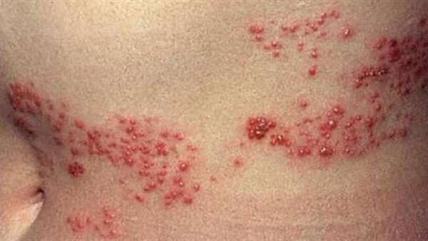 ظهور الطفح على شكل شريط أو حزام على جهة واحدة من الجسم وتظهر العديد من البثور والفقاقيع الصغيرة فوق الطفح وتحتوي على سائل وصديد.