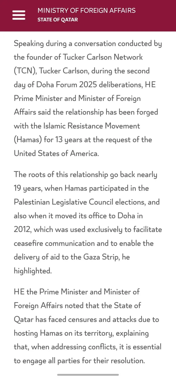 وقال معالي رئيس مجلس الوزراء وزير الخارجية، خلال مداخلة أجراها مؤسس شبكة تاكر كارلسون (TCN)، تاكر كارلسون، خلال اليوم الثاني من مداولات منتدى الدوحة 2025، إن العلاقة مع حماس تم بناؤها منذ 13 عامًا بناءً على طلب الولايات المتحدة الأمريكية.