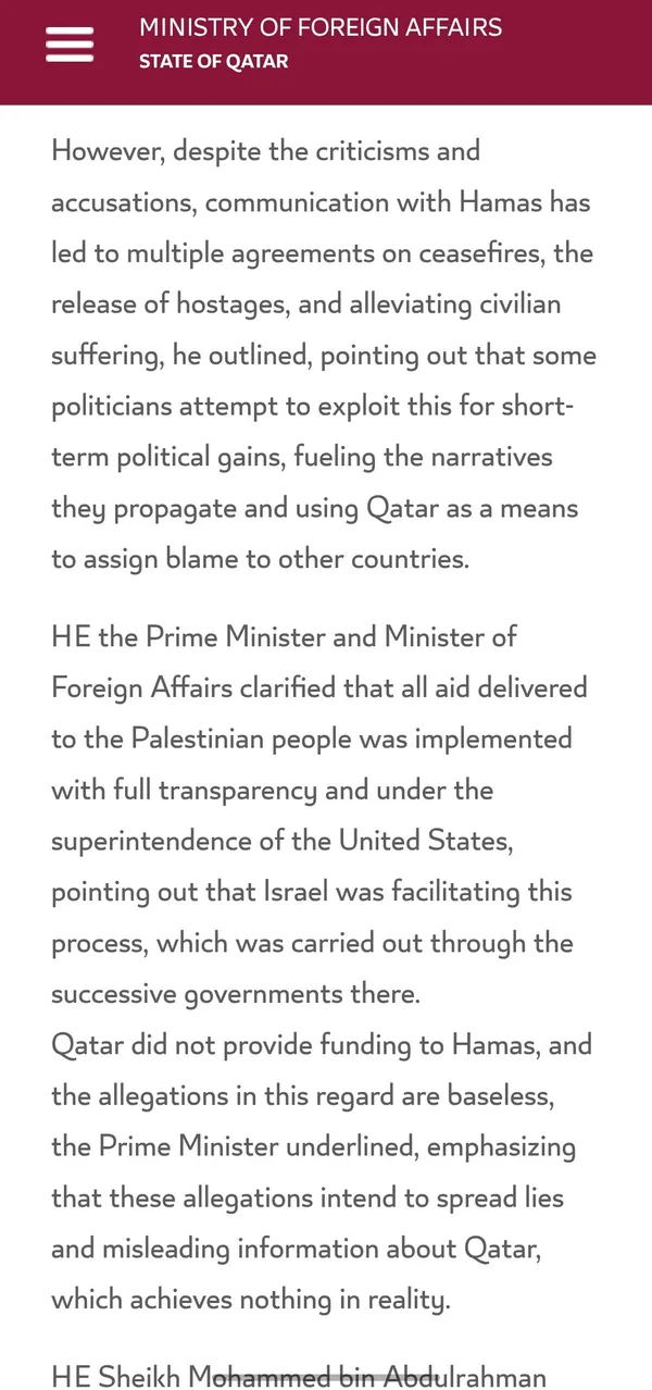وأكد معاليه أن قطر لم تُقدّم تمويلًا لحماس، وأن الادعاءات في هذا الشأن لا أساس لها من الصحة، مؤكدًا أن هذه الادعاءات تهدف إلى نشر الأكاذيب والمعلومات المضللة عن قطر، وهو ما لا يُحقق شيئًا على أرض الواقع.