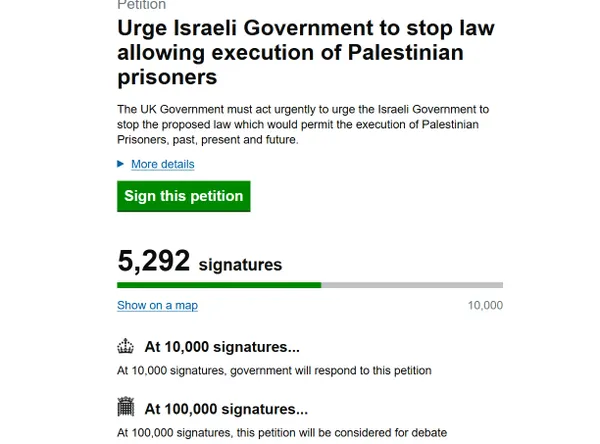 أُطلقت عريضة رسمية على موقع عرائض الحكومة والبرلمان في المملكة المتحدة تطالب بتدخل عاجل من الحكومة البريطانية للضغط على إسرائيل من أجل وقف قانون يتيح إعدام الأسرى الفلسطينيين، في خطوة تعكس تصاعد القلق الدولي تجاه هذا التشريع.