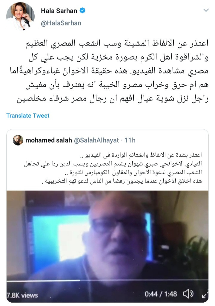 وكتبت هالة سرحان: 'أعتذر عن الألفاظ المشينة وسب الشعب المصري العظيم، والشراقوة أهل الكرم، بصورة مخزية لكن يجب علي كل مصري مشاهدة الفيديو.. هذه حقيقة الإخوان غباء وكراهيةً إما هم وإما حرق وخراب مصر، والخيبة أنه يعترف بأن مفيش راجل نزل شوية عيال.. افهم ان رجال مصر شرفاء مخلصين'.