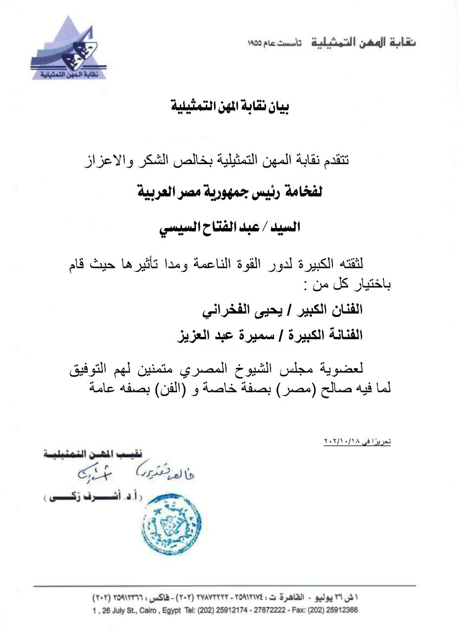وجاء في البيان: تتقدم نقابة المهن التمثيلية بخالص الشكر والإعزاز للرئيس عبد الفتاح السيسي، لثقته الكبيرة لدور القوة الناعمة ومدى تأثيرها، بعد اختياره الفنان الكبير يحيى الفخراني، والفنانة الكبيرة سميرة عبد العزيز، متمنين لهما التوفيق لما فيه صالح مصر بصفة خاصة والفن بصفة عامة.