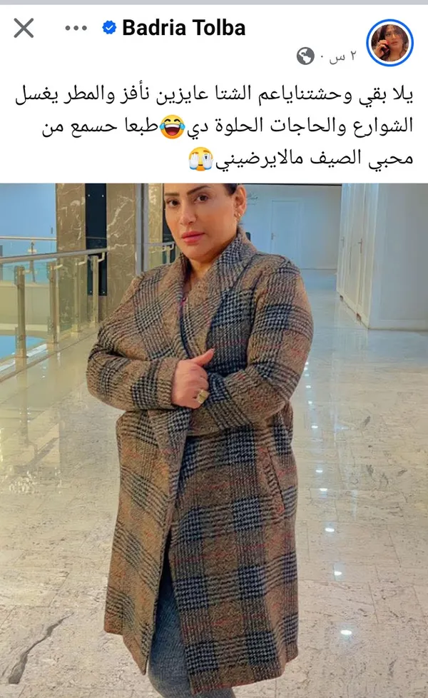ونشرت بدرية عبر حسابها الرسمي بموقع 'فيسبوك' صورة لها بإطلالة شتوية، وكتبت معلقة: 'يلا بقى وحشتنا يا عم الشتا، عايزين نافذ والمطر يغسل الشوارع والحاجات الحلوة دي، طبعًا هسمع من محبي الصيف ما لا يرضيني'، في إشارة إلى تفاعلها مع متابعيها الذين يفضلون الأجواء الصيفية.