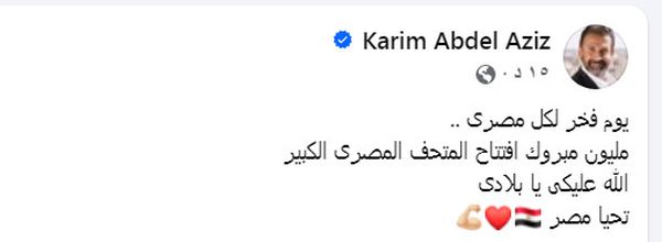 وكتب كريم على صفحته: 'يوم فخر لكل مصري.. مليون مبروك افتتاح المتحف المصري الكبير.. الله عليكي يا بلادي.. تحيا مصر'.
