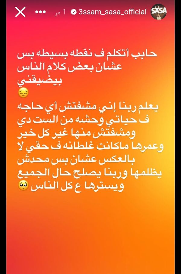 وأضاف صاصا أنه ضاق ذرعًا ببعض التعليقات التي تزعجه، موضحًا أنه يفضّل توضيح موقفه حتى لا يتعرض أحد للظلم، مؤكدًا في الوقت نفسه أنه يتمنى أن يصلح الله حال الجميع ويسترهم.