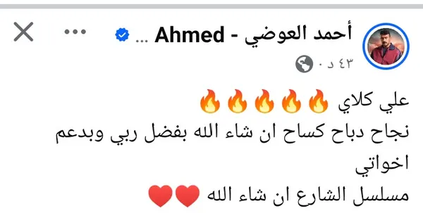 وكتب العوضي في منشوره: «علي كلاي نجاح نجاح كاسح إن شاء الله بفضل ربي وبدعم إخواتي»، في رسالة حملت نبرة ثقة وحماس، مشيرًا إلى أن دعم الجمهور كان عاملًا أساسيًا في نجاحاته المتتالية، ومتمنيًا أن يواصل العمل تحقيق صدى قوي عند عرضه.