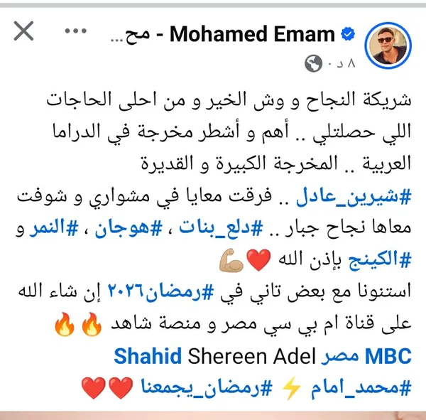 وكتب محمد إمام أن شيرين عادل تُعد واحدة من أهم وأشطر المخرجات في الدراما العربية، مشيرًا إلى أنه عمل معها من قبل في مشواره وحقق معها نجاحات قوية من خلال أعمال مثل «دلع بنات» و«هوجان» و«النمر»، وهو ما جعله يشعر بالثقة والحماس للتعاون مجددًا.