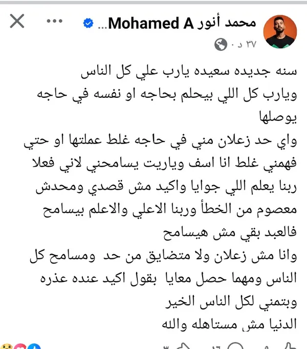 وأكد أنور في رسالته أنه يعتذر عن أي موقف قد يكون تسبب في زعل أي شخص منه، سواء كان عن قصد أو بدون قصد، مشددًا على أن الخطأ وارد، وأن الله وحده هو المعصوم من الخطأ، داعيًا للتسامح ونقاء القلوب.