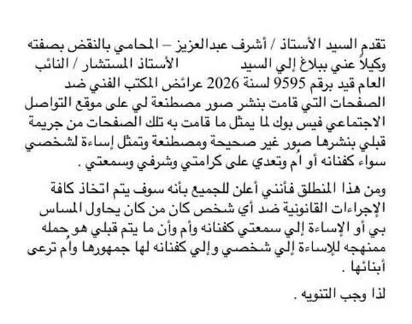 وأوضحت أنها لم تعد تكتفي بتجاهل مثل هذه التجاوزات، رغم ثقتها الكاملة في وعي جمهورها، مؤكدة أن قرارها لا يخصها وحدها، بل يمثل رسالة دعم لكل امرأة تتعرض للتشهير أو الإساءة أو الفبركة، داعية الجميع إلى عدم التردد في اللجوء للقانون لحماية الحقوق والكرامة.