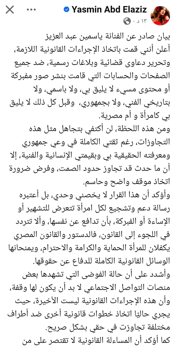 وأكدت ياسمين، عبر بيان رسمي نشرته على صفحتها بموقع فيسبوك، أنها حررت دعاوى قضائية وبلاغات رسمية ضد كل من تورط في نشر أو تداول محتوى لا يليق بها كفنانة وكسيدة مصرية، مشددة على أن ما حدث تجاوز حدود الصمت وفرض ضرورة اتخاذ موقف واضح وحاسم.