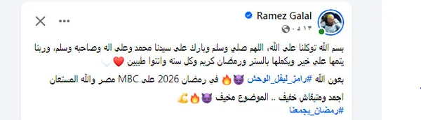 وتابع رامز جلال:'بعون الله رامز ليفل الوحش في رمضان 2026 على MBC مصر والله المستعان، أجمد ومتبقاش خفيف.. الموضوع مخيف، رمضان يجمعنا'.