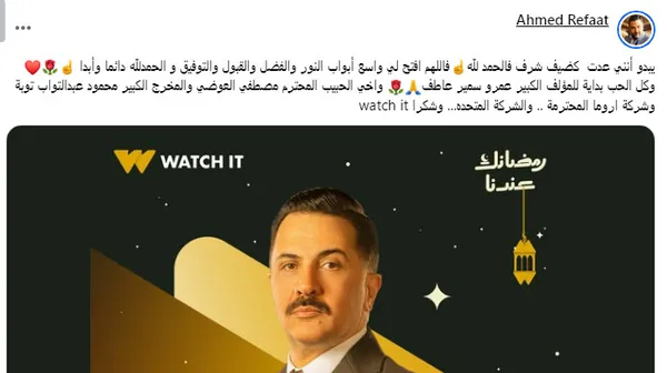 وتابع رفعت:'كل الحب بداية للمؤلف الكبير عمرو سمير عاطف، وأخي الحبيب المحترم مصطفي العوضي والمخرج الكبير محمود عبدالتواب توبة وشركة اروما المحترمة .. والشركة المتحده.. وشكرا watch it'.