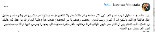 وكتبت نشوى: 'يارب ساعدني.. بحاول أدرب نفسي أني أكون أكتر سماحة وأني ما أغضبش ولا أتناقش مع حد بيستهلك من سلام روحي وهدوء نفسي.. بحاول أوقف مناقشات مع الناس اللي ماسكين في آرائهم ورؤيتهم للأمور بتعصب وعنصرية، بس الموضوع صعب جدًا'.