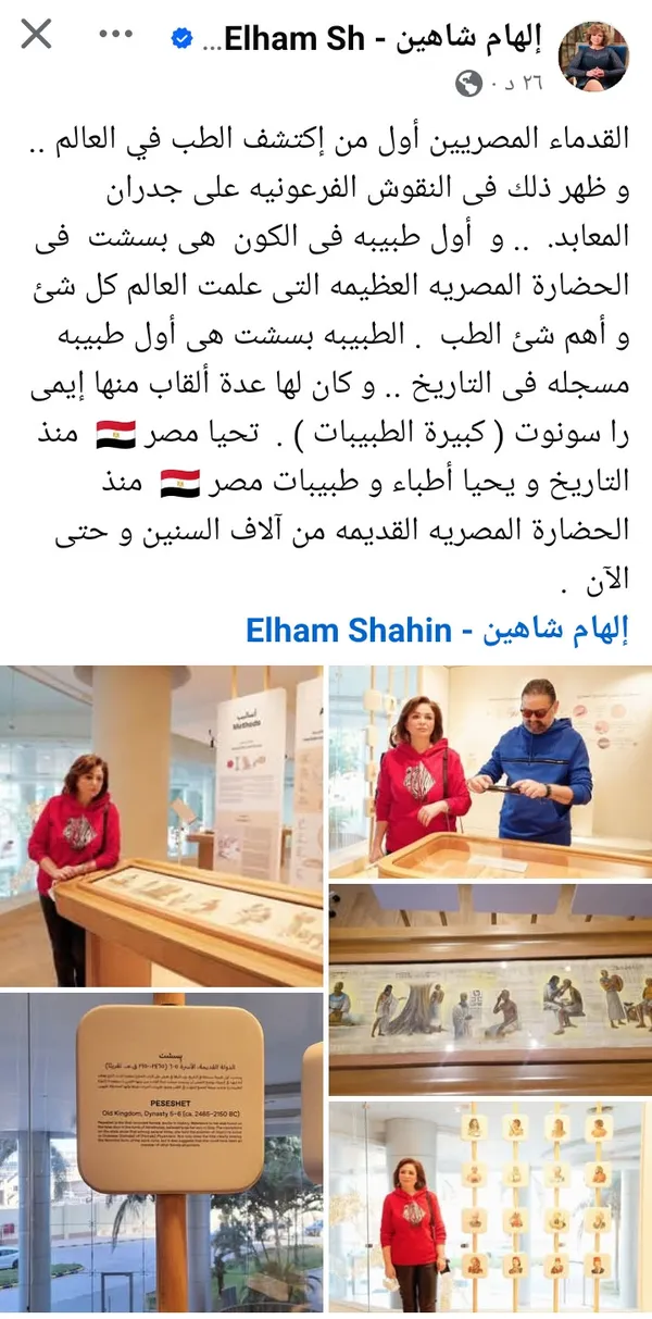وأضافت شاهين، عبر حسابها على «فيسبوك»، أن أول طبيبة مسجلة في التاريخ هي «بسشِت» من الحضارة المصرية القديمة، والتي حملت ألقابًا عدة من بينها «كبيرة الطبيبات»، مؤكدة فخرها بتاريخ مصر الطبي الممتد لآلاف السنين.