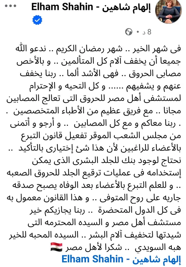 وخلال منشورها، دعت شاهين الله أن يخفف آلام كل المتألمين، مؤكدة أهمية دعم المستشفيات الخيرية التي توفر العلاج بدون مقابل، كما أشادت بالسيدة هبة السويدي التي أسست المستشفى بهدف التخفيف عن المرضى وتقديم الرعاية الإنسانية.