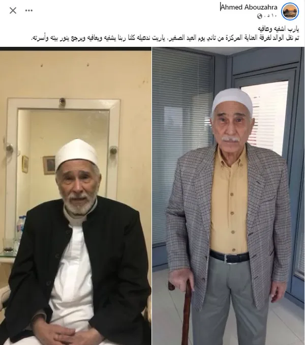 وكتب نجل الفنان عبر حسابه على فيس بوك: 'يارب أشفيه وعافيه.. تم نقل الوالد لغرفة العناية المركزة من تاني يوم العيد الصغير، ياريت ندعيله كلنا ربنا يشفيه ويعافيه ويرجع ينور بيته وأسرته'.