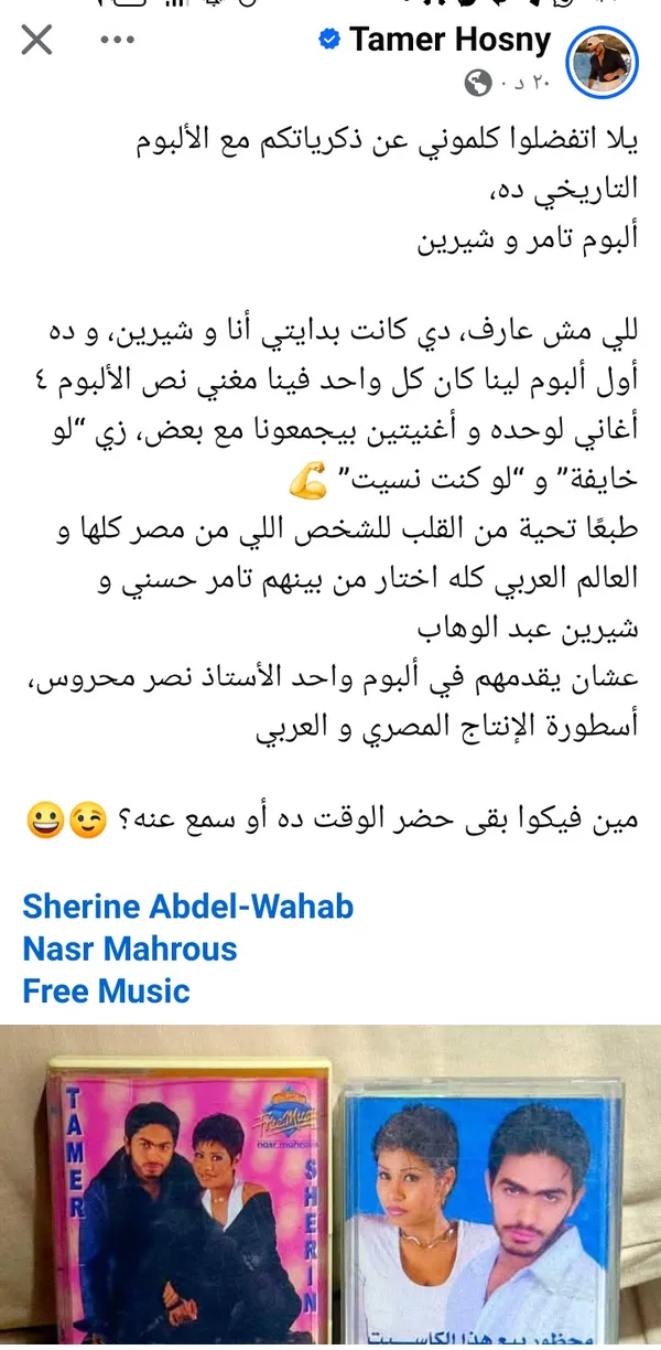 في لفتة مليئة بالحنين، استعاد النجم تامر حسني ذكريات بدايته الفنية من خلال منشور عبر حسابه الرسمي على فيسبوك، تحدث فيه عن الألبوم المشترك الذي جمعه بالنجمة شيرين عبد الوهاب، والذي اعتبره نقطة انطلاق حقيقية لهما في عالم الغناء.