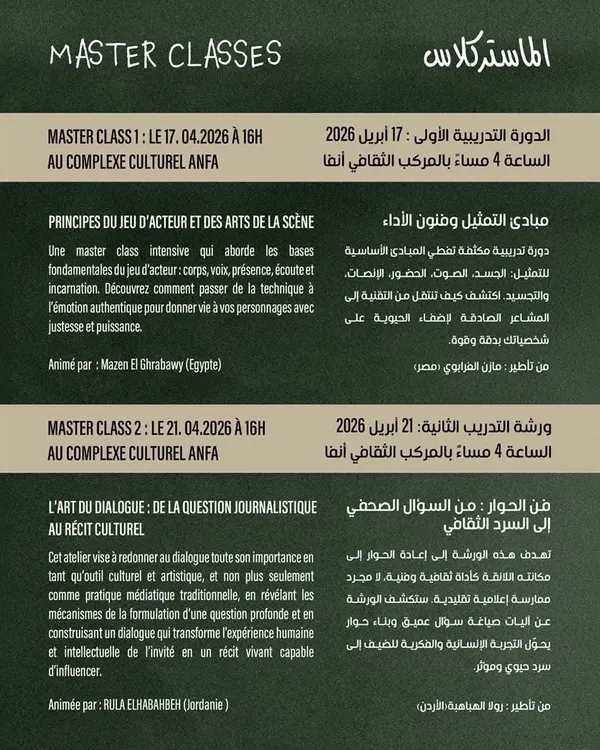 ويقدّم المهرجان على مدى عشرة أيام برنامجاً غنياً يجمع عروضاً مسرحية من فلسطين وإيطاليا وفرنسا والمغرب، إلى جانب ندوات فكرية وورشات تدريبية (ماستر كلاس)، تفتح المجال أمام التفاعل المباشر بين الفنانين والجمهور، وتعزز تبادل الخبرات في فضاء ثقافي عابر للحدود.