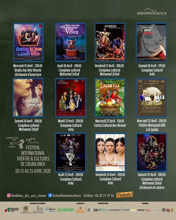 تحتضن مدينة الدار البيضاء – فعاليات الدورة التاسعة عشرة من المهرجان الدولي للمسرح والثقافات، الذي تنظمه مؤسسة الفنون الحية خلال الفترة من 15 إلى 25 أبريل 2026، بمشاركة دولية واسعة تعكس تنوع التجارب المسرحية المعاصرة، وتؤكد دور الفنون الحية كجسر للحوار بين الشعوب.