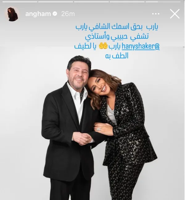 ونشرت أنغام عبر حسابها الرسمي على تطبيق إنستجرام رسالة مؤثرة قالت فيها:'يا رب بحق اسمك الشافي، اشفِ حبيبي وأستاذي، يا رب يا لطيف الطف به.'