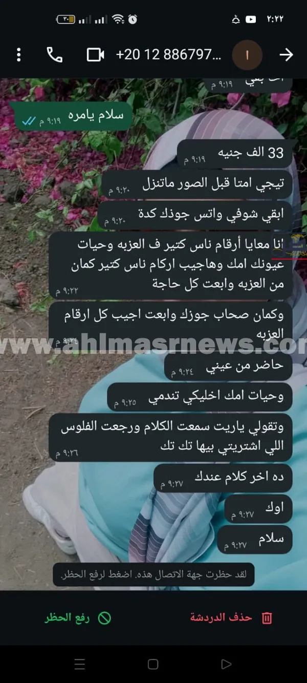 وأشارت إلى أن المتهم لم يكتفِ بابتزازها، بل انتقل إلى تهديد زوجها أيضًا، حيث أرسل له رسائل يزعم فيها وجود علاقة غير شرعية بينها وبينه، ملوحًا بنشر صور ومحتوى مسيء لتشويه سمعتها داخل القرية.