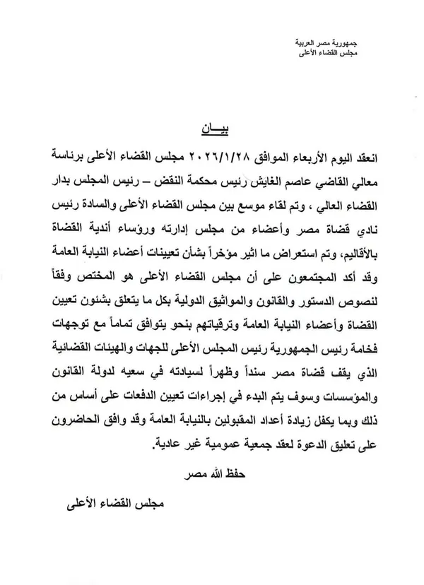 انعقد اليوم الأربعاء مجلس القضاء الأعلى برئاسة معالي القاضي عاصم الغباشي رئيس محكمة النقض – رئيس المجلس بدار القضاء العالي، وتم لقاء موسع بين مجلس القضاء الأعلى والسادة رئيس نادي قضاة مصر وأعضاء من مجلس إدارته ورؤساء أندية القضاة بالأقاليم، وتم استعراض ما أثير مؤخرًا بشأن تعيينات أعضاء النيابة العامة.