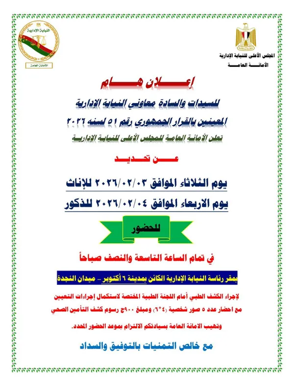 أعلنت الأمانة العامة للمجلس الأعلى للنيابة الإدارية عن موعد إجراء الكشف الطبي لمعاوني النيابة الإدارية المعينين بالقرار الجمهوري رقم ٥١ لسنة ٢٠٢٦.