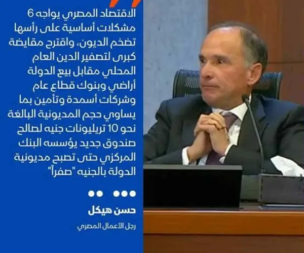 وفي يناير الماضي، اقترح رجل الأعمال المصري حسن هيكل مبادلة الدين العام المحلي بالأصول، من خلال بيع الدولة أراضي وبنوك قطاع عام وشركات في قطاعات مثل الأسمدة والتأمين، بما يعادل حجم المديونية البالغ نحو 10 تريليونات جنيه، وإنشاء صندوق جديد بإشراف البنك المركزي لتصبح مديونية الدولة بالجنيه صفرًا، في محاولة لتخفيف الضغوط المالية وتحسين إدارة الموارد.