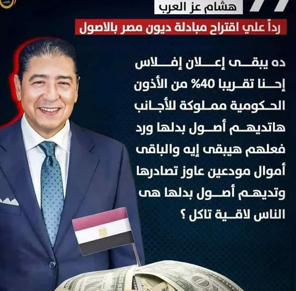 وعلق هشام عز العرب،الخبير المصرفي والرئيس التنفيذي الحالي للبنك التجاري الدولي (CIB)، على هذا المقترح، واعتبره إعلان إفلاس محتمل للدولة.
