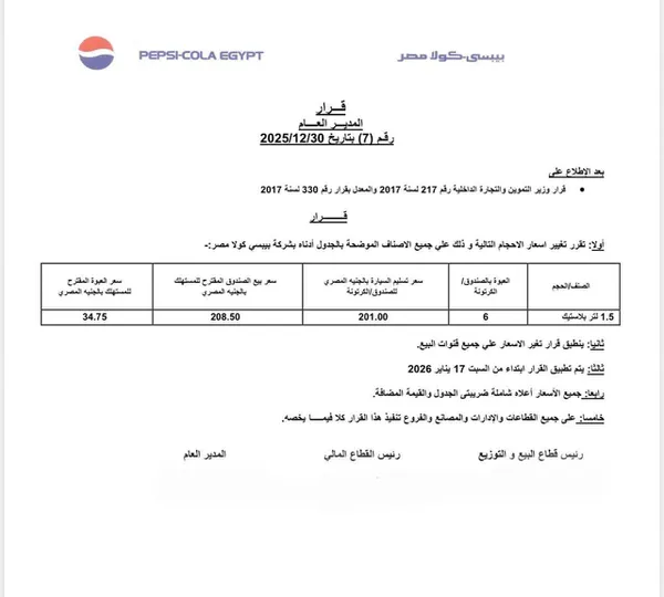 وبحسب مستند من شركتي بيبسي وكوكاكولا موجه للتجار ارتفع سعر زجاجة بيبسي حجم 1.5لتر إلى 34.75 جنيه مقابل 30 جنيها قبل الزيادة.