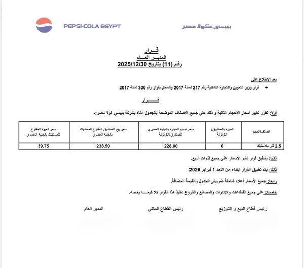 وأشار المنوفي، إلى أن شركة بيبسي قررت رفع سعر عبوة 2.5 لتر من 35 إلى 39.75 جنيهًا، بدءا من فبراير المقبل.