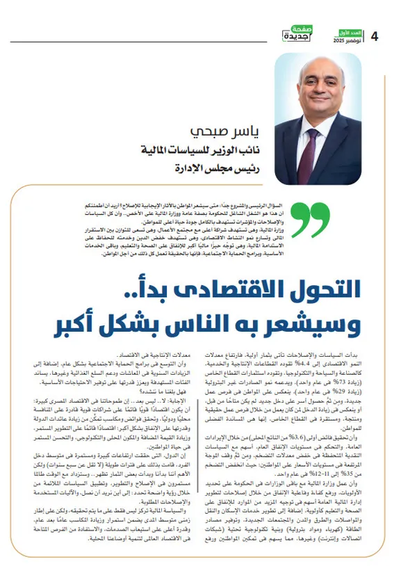 أكد ياسر صبحي، نائب وزير المالية للسياسات المالية ورئيس مجلس الإدارة صفحة جديدة، أن كل الإصلاحات والسياسات المالية التي تنفذها الحكومة تستهدف بشكل مباشر رفع جودة حياة المواطنين وتعزيز قدرتهم على تلبية احتياجاتهم الأساسية.