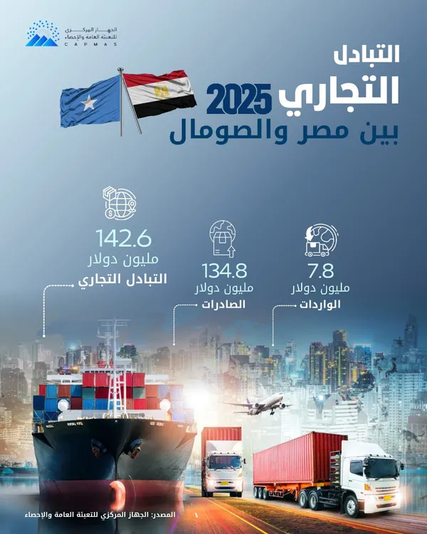 في إطار تعزيز العلاقات الثنائية بين مصر والصومال إلى جانب تبادل الرؤي حول مستجدات القضايا الإقليمية والدولية ذات الاهتمام المشترك يستقبل اليوم السيد الرئيس عبد الفتاح السيسى الرئيس ' حسن شيخ محمود ' رئيس جمهورية الصومال الفيدرالية الشقيقة ، وحرصاً من الجهاز المركزى للتعبئة العامة والإحصاء على متابعة الأنشطة والزيارات الرسمية للسيد الرئيس وإصدار بيان صحفى يتضمن العلاقات الاقتصادية بين مصر والصومال فقد أظهرت بيانات الجهاز اليوم الأحد الموافق 8/2/2026 أن حجم التبادل التجارى بين مصر والصومال وصل إلى 142.6 مليون دولار خلال عام 2025 مقابل 127.8 مليون دولار خلال عام 2024 بنسبة ارتفاع قدرها 11.6 % .\