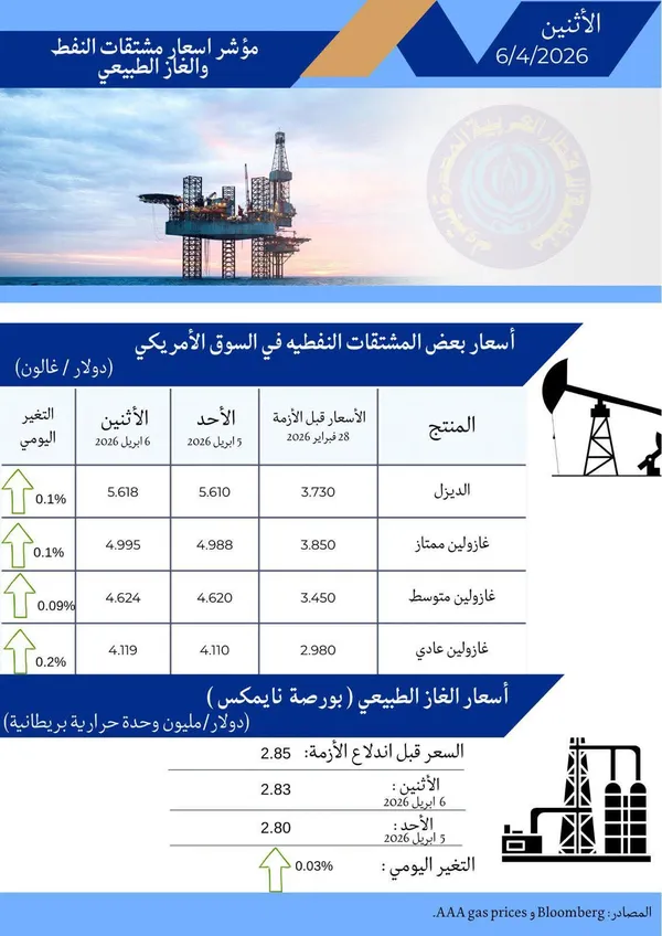 نشرت منظمة الدول العربية المصدرة للبترول، مؤشرات أسعار المشتقات النفطية بالولايات المتحدة الأمريكية وأسعار الغاز الطبيعى اليوم الأثنين 6 أبريل 2026.