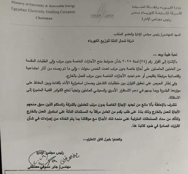 وأوضح الخطاب الموجه إلى شركة شمال الدلتا لتوزيع الكهرباء أن القرار يأتي في إطار تحقيق التوازن بين متطلبات التشغيل واستمرارية الأداء، وبين الحفاظ على الاستقرار الأسري والمعيشي للعاملين، وتجنب فقد الكوادر الفنية المتميزة.