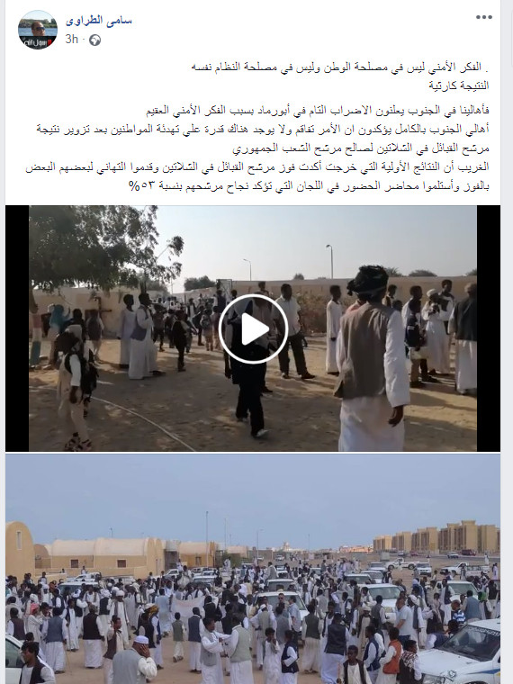 وقال أحد الأهالي، 'الفكر الأمني ليس في مصلحة الوطن وليس في مصلحة النظام نفسه، النتيجة كارثية، فأهالينا في الجنوب يعلنون الإضراب التام في أبورماد بسبب الفكر الأمني العقيم، وأهالي الجنوب بالكامل يؤكدون أن الأمر تفاقم ولا يوجد هناك قدرة على تهدئة المواطنين بعد تزوير نتيجة مرشح القبائل في الشلاتين لصالح مرشح الشعب الجمهوري'.