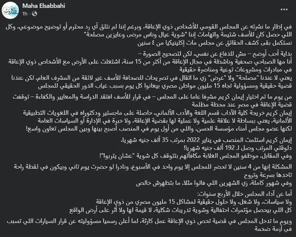 وتابعت: بداية أحب أوضح مش للدفاع عن نفسي، لكن لتصحيح الصورة.. أنا مها الصباحي صحفية وناشطة في مجال الإعاقة من أكتر من 15 سنة، اشتغلت على الأرض مع الأشخاص ذوي الإعاقة في مبادرات ومشروعات توعية ومناصرة حقيقية، يعني لا عندنا 'مصلحة' ولا 'غرض' زي ما اتقال في تصريحات للصحافة للأسف غير لائقة من المشرف العام، لكن عندنا قضية حقيقية ومسؤولية تجاه 15 مليون مواطن مصري بيعانوا كل يوم بسبب غياب الدور الحقيقي للمجلس.